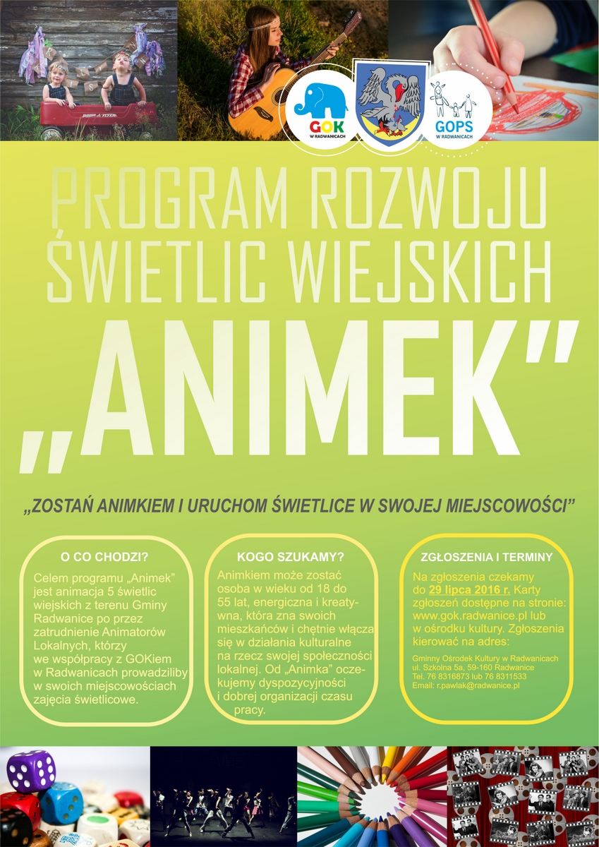Informujemy, że od stycznia 2017 r do marca 2017 r. kontynuujemy nasz Program Rozwoju Świetlic Wiejskich "Animek". Zapraszamy do udziału mieszkańców Gminy Radwanice w poszczególnych świetlicach wiejskich: Przesieczna, Łagoszów Wielki, Kłębanowice, Nowa Kuźnia, Nowy Dwór, Buczyna.